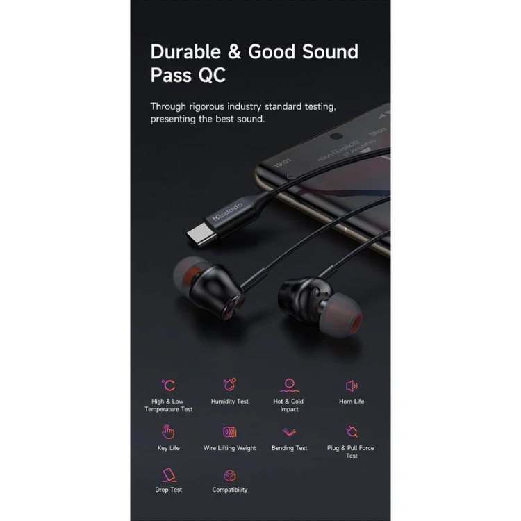 هندزفری تایپ سی مک دودو صدای باکیفیت را با باس عمیقتر در لایههای میانی طوری تنظیم میکند که برای گوش بسیار مناسب خواهد بود. به علاوه حداکثر نرخ نمونه برداری صوتی دیجیتال این هندزفری 24 بیت/96 کیلوهرتز، امپدانس 32 اهم و بلندگو های 10 میلی متر با درایورهای واحد ساخته شده با دیافراگم درجه یک است. همچنین استفاده از سیم های OFC باعث کاهش نویز و سیگنال صوتی میشود.