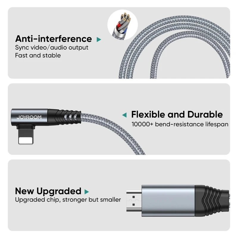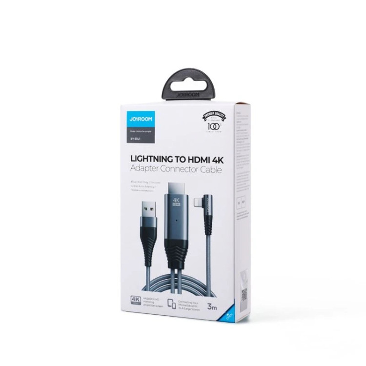 کابل لایتنینگ به HDMI جویروم JoyRoom SY35L Lightning to HDMI 4K Adapter Connector Cable طول 3 متر یکی از بزرگترین سرگرمی های بشر در چند سال اخیر دیدن فیلم خصوصا در جمع های دوستانه بوده که حالا به لطف تلفن های هوشمند امروزی می توان به راحتی در هرجایی به فیلم دیدن پرداخت. اما یکی از بزرگترین معایب دیدن فیلم در موبایل ها؛ کوچک بودن صفحه نمایش آن است که به لطف فناوری Casting این مشکل تاحدودی حل شده اما یکی از معضلات این سیستم محدودیت آن به تلویزیون هایی است که دارای این فناوری هستند. با کابل JoyRoom SY35L جویروم می توانید گوشی های آیفون و iPad را به تلویزیون و پروژکتور خود متصل کنید. جنس کابل لایتنینگ (یا همان کابل آیفونی) به HDMI جویروم SY35L از پلاستیک مقاوم و انعطاف پذیر بوده و روکش سیم داخلی آن از آلیاژ آلومینیوم می باشد. پورت های این کابل فلزی بوده که دارای کیفیت بالا و بسیار مقاومی است. طول این کابل 3 متر بوده، بعلاوه طول کابل USB آن 0.5 متر می باشد. با توجه به تراشه هوشمند به کار رفته در این کابل، شما شاهد تصاویری بسیار شفاف، واضح و با تاخیر بسیار پایینی خواهید بود که بسیار کاربردی است. بعلاوه حداکثر رزولوشن این کابل 4K@60Hz می باشد. برای انتقال تصاویر از گوشی های آیفون و آی پد نیاز است که کانکتورHDMI این کابل را به پورت HDMI تلویزیون زده، کانکتور یو اس بی (USB) آن را به پورت USB یا با آداپتور به برق و یا به پاوربانک برای دریافت انرژی متصل کنید. اتصال کابل USB برای تامین انرژی ضروری می باشد. این کابل با تمام گوشی های آیفون دارای IOS 8.0 به بالا و دارای پورت لایتنینگ سازگار هستند.