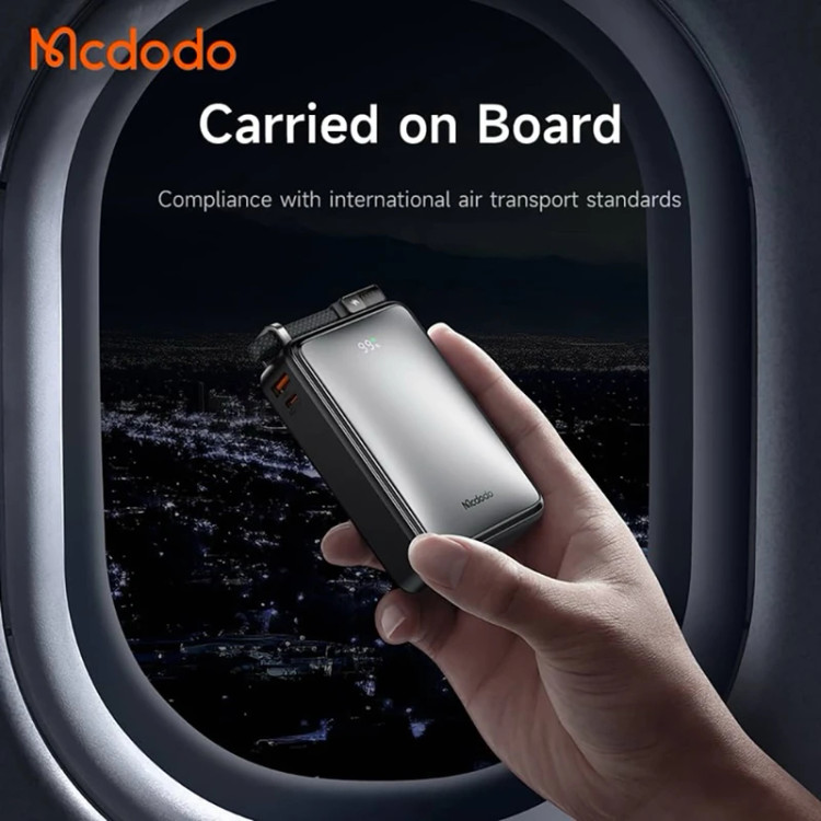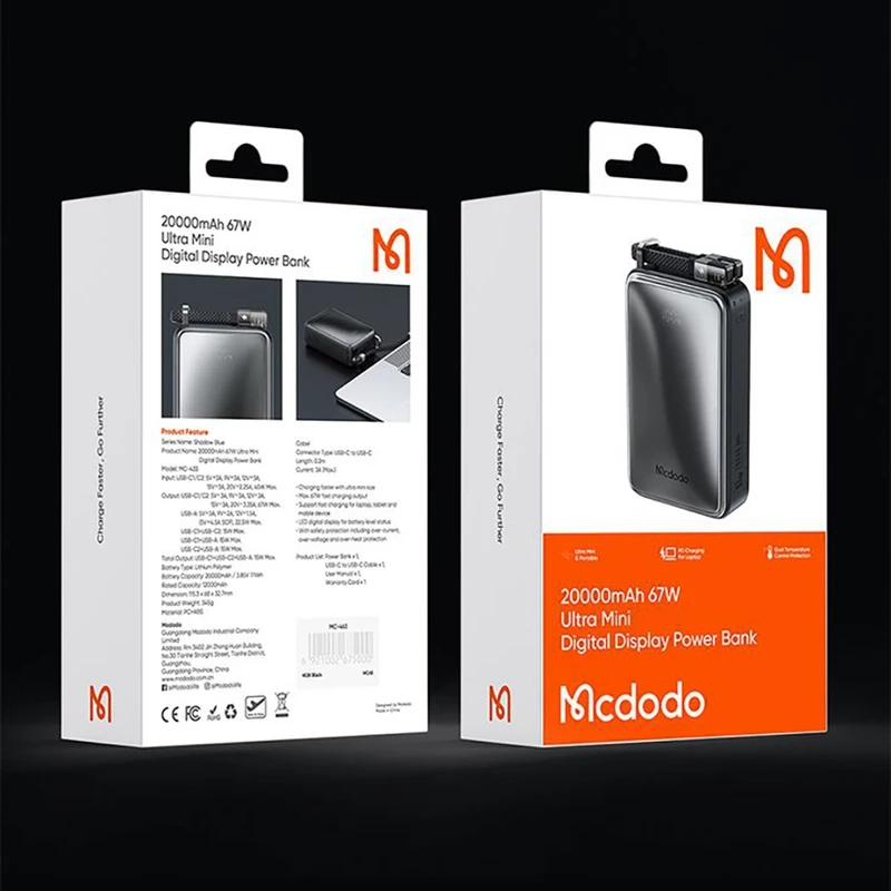 پاوربانک مک دودو مدل MC-433 67W، ظرفیت 20000 میلیآمپر ساعت، تکنولوژی 4.0 Quick Charge، فناوری USB PD، شارژ ایمن، تخصیص هوشمند شدت جریان خروجی، جنس بدنه پایکربنات، دارای 3 درگاه خروجی