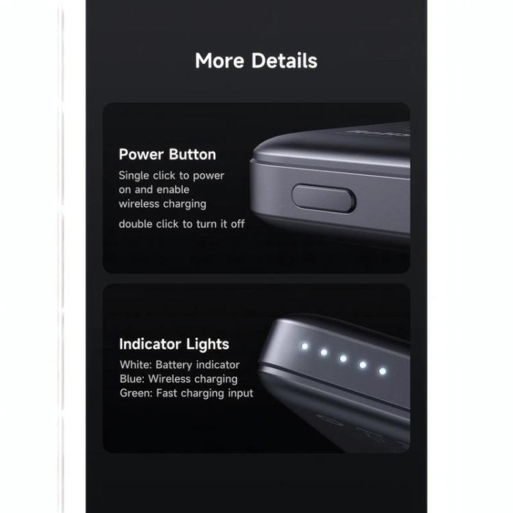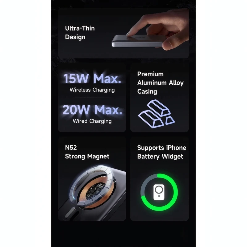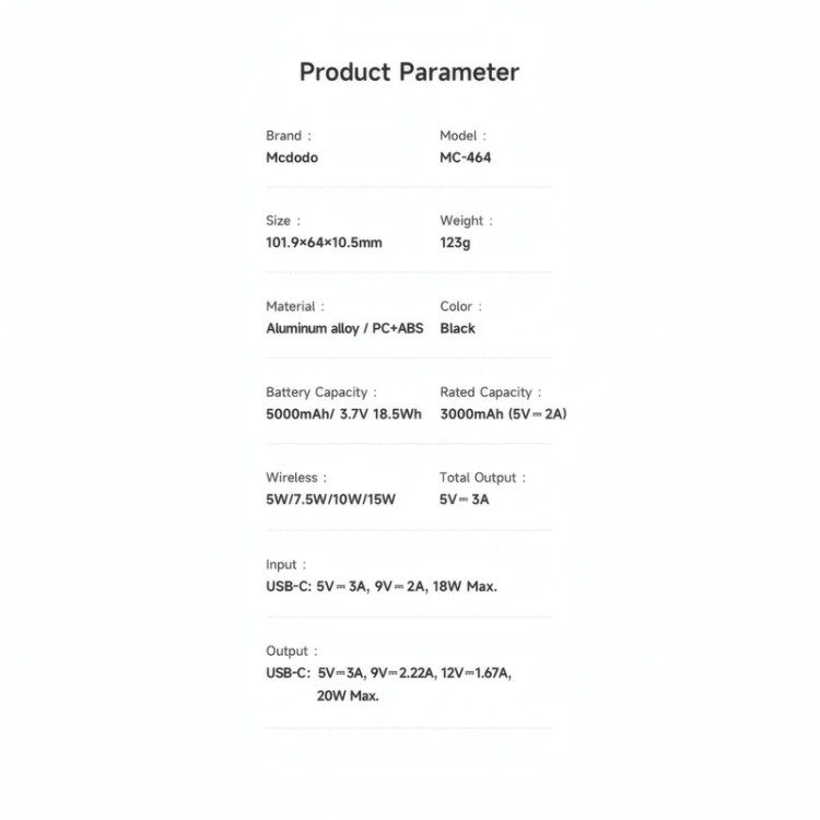 ابعاد: ۱۰.۵×۶۴×۱۰۱ میلیمتر وزن: ۱۲۳ گرم ظرفیت اسمی: ۵۰۰۰ میلیآمپر ساعت جنس بدنه: آلیاژ آلومینیوم + ABS درگاه ورودی: تایپ C (حداکثر ۱۸ وات) درگاه خروجی: تایپ C (حداکثر ۲۰ وات) و پد شارژ وایرلس (حداکثر ۱۵ وات)