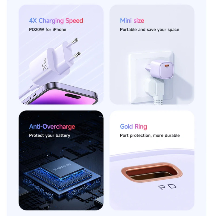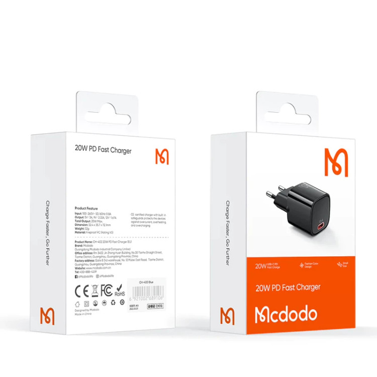شارژر فست 20 وات مک دودو مدل CH-402، دارای خروجی Type-C، امکان شارژ کردن سریعتر موبایل با شدت جریان 2.0 آمپر و بالاتر، شارژ ایمن (MultiProtect)