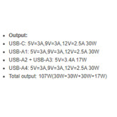 توضیحات : USB-C: ۵V=۳A,۹V=۳A,۱۲V=۲.۵A ۳۰W USB-A۱: ۵V=۳A,۹V=۳A,۱۲V=۲.۵A ۳۰W USB-A۲ + USB-A۳: ۵V=۳.۴A ۱۷W USB-A۴: ۵V=۳A,۹V=۳A,۱۲V=۲.۵A ۳۰W Total output: ۱۰۷W(۳۰W+۳۰W+۳۰W+۱۷W)