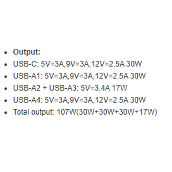 USB-C: ۵V=۳A,۹V=۳A,۱۲V=۲.۵A ۳۰W USB-A۱: ۵V=۳A,۹V=۳A,۱۲V=۲.۵A ۳۰W USB-A۲ + USB-A۳: ۵V=۳.۴A ۱۷W USB-A۴: ۵V=۳A,۹V=۳A,۱۲V=۲.۵A ۳۰W Total output: ۱۰۷W(۳۰W+۳۰W+۳۰W+۱۷W)