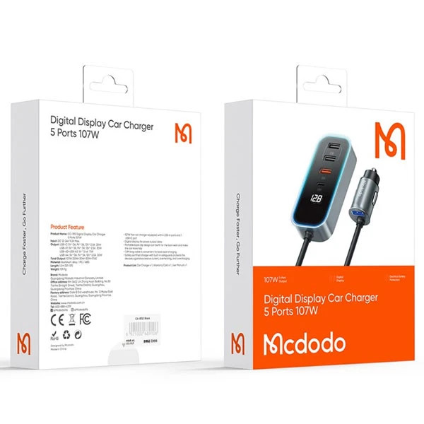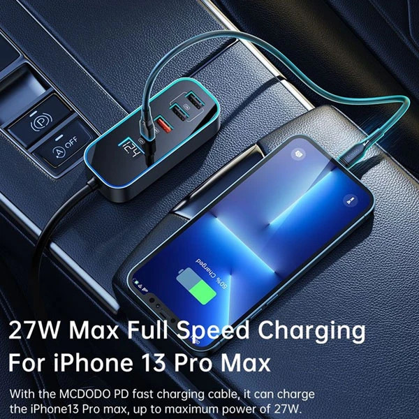 USB-Ax4+Type-Cx1، از شارژ سریع چند دستگاه به طور همزمان پشتیبانی می کند با کابل شارژ سریع MCDODO PD (شامل نمی شود)، می تواند برای iPhone13 Pro max، حداکثر توان 27 وات شارژ شود. چندین پروتکل شارژ سریع (PPS/PD3.0/QC4+/QC3.0/AFC/FCP) برای رفع نیازهای شارژ سریع دستگاههای مختلف مانند آیفون / هواوی / شیائومی / سامسونگ با طراحی گیره پشتی، تعمیر آسان، کابل پسوند 1.5 متری، بدون محدودیت در اتاق صفحه نمایش LED، نظارت خودکار ولتاژ باتری، نظارت عملی ایمن تر است نور نرم هنگام وصل شدن، پیدا کردن شارژر در ماشین آسان است سازگار با مدل های مختلف فندک. قابل استفاده برای خودروها و کامیون های 12V/24V